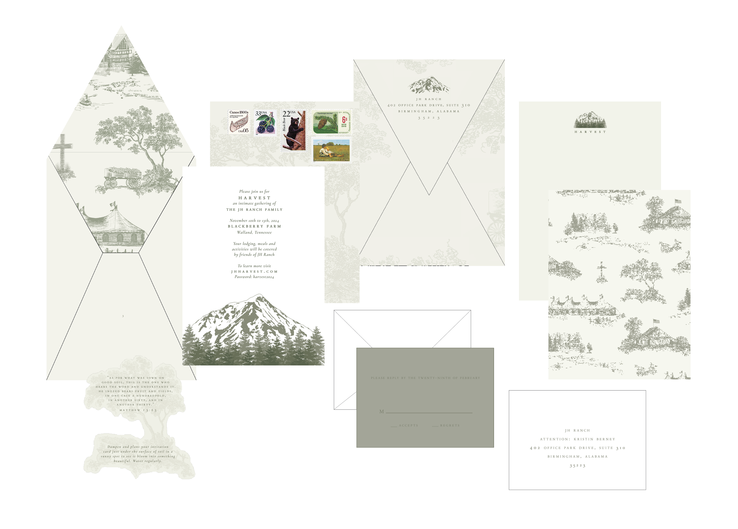 For this project, I developed the full visual identity and event branding for Harvest, an exclusive donor experience hosted by JH Ranch at the renowned Blackberry Farm. Designed for a small group of about 22 couples, the weekend invited longtime supporters into an intimate and immersive celebration of how far JH Ranch has come—and where the ministry is headed as it approaches its 50-year milestone in 2030.