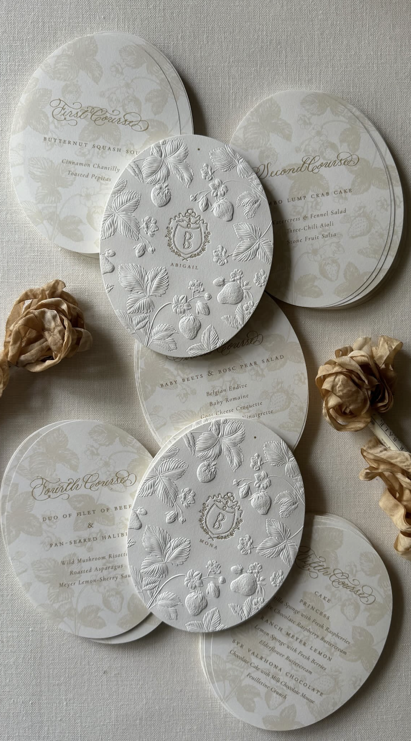 Another highlight was the sculpted, embossed dinner menus, tied with vintage ribbon I sourced months earlier at an antique market in Roundup, TX. Every detail was intentional, every moment a part of the story we were telling — and it’s experiences like this that inspire me to continue designing beyond paper, crafting moments that are unforgettable.